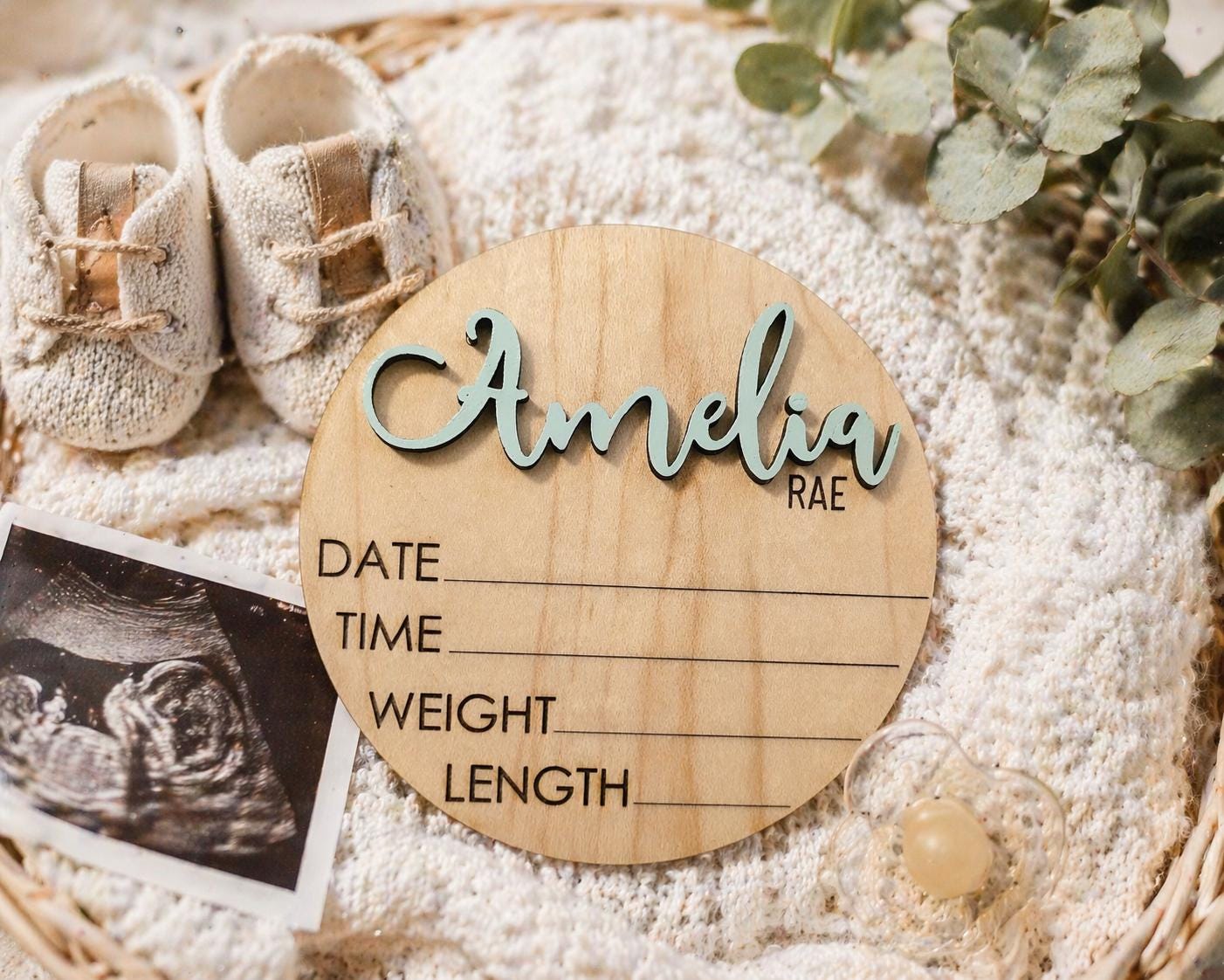 A timeless wooden keepsake customized with your baby’s name, birth date, time, weight, and length.