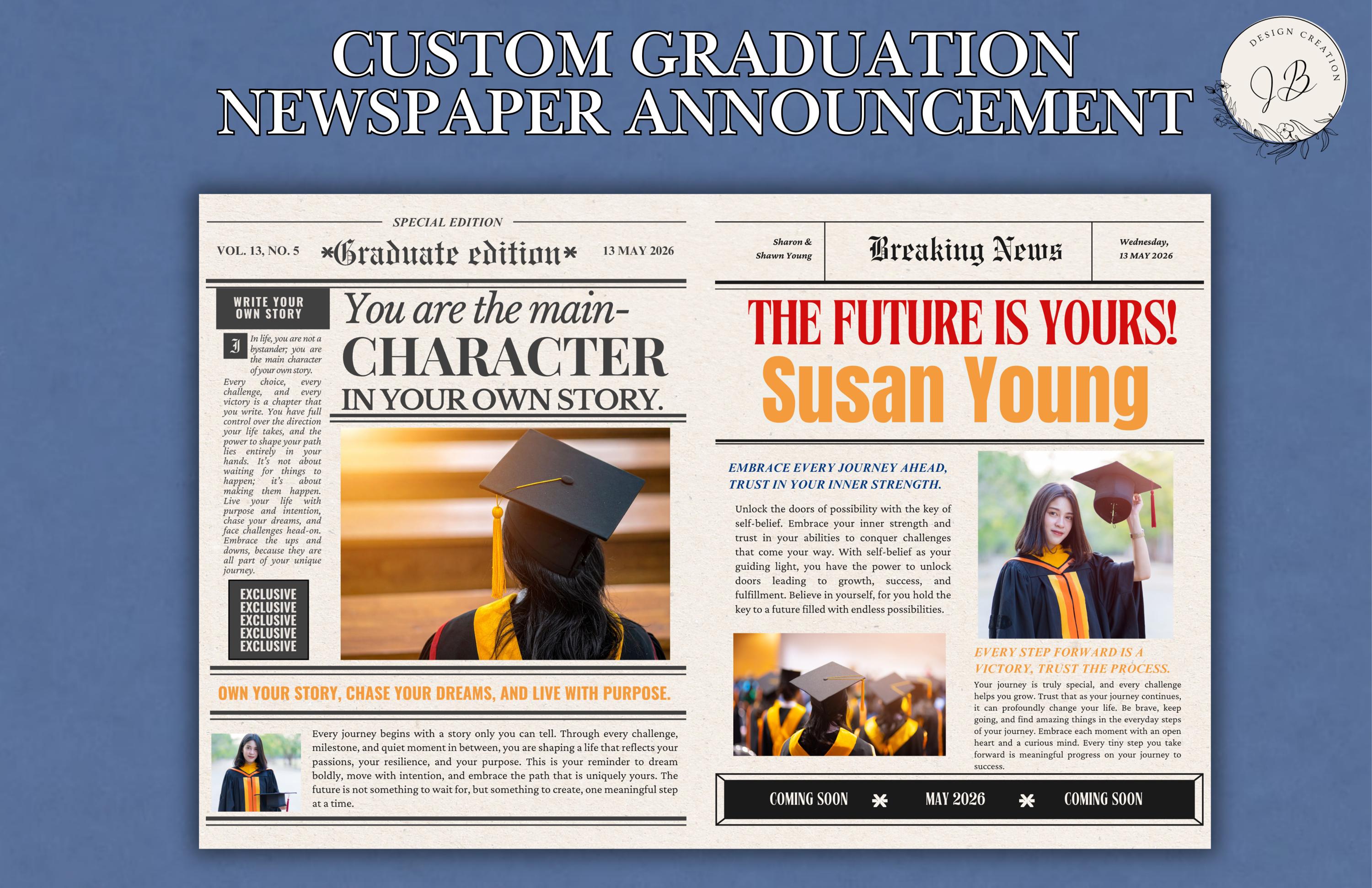 Celebrate your senior year in a unique and unforgettable way with a custom graduation newspaper announcement designed just for you. This personalized keepsake highlights your achievements, personality, and journey—perfect for announcements, parties, or meaningful gifts.